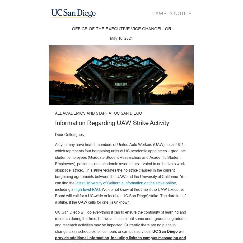 As you may have heard, members of United Auto Workers (UAW) Local 4811, which represents four bargaining units of UC academic appointees – graduate student employees (Graduate Student Researchers and Academic Student Employees), postdocs, and academic researchers – voted to authorize a work stoppage (strike). This strike violates the no-strike clauses in the current bargaining agreements between the UAW and the University of California. You can find the latest University of California information on the strike online, including a high-level FAQ. We do not know at this time if the UAW Executive Board will call for a UC-wide or local (at UC San Diego) strike. The duration of a strike, if the UAW calls for one, is unknown.