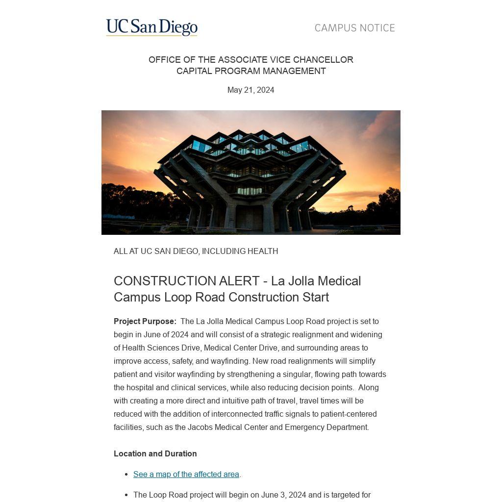 Project Purpose: The La Jolla Medical Campus Loop Road project is set to begin in June of 2024 and will consist of a strategic realignment and widening of Health Sciences Drive, Medical Center Drive, and surrounding areas to improve access, safety, and wayfinding. New road realignments will simplify patient and visitor wayfinding by strengthening a singular, flowing path towards the hospital and clinical services, while also reducing decision points. Along with creating a more direct and intuitive path of travel, travel times will be reduced with the addition of interconnected traffic signals to patient-centered facilities, such as the Jacobs Medical Center and Emergency Department.