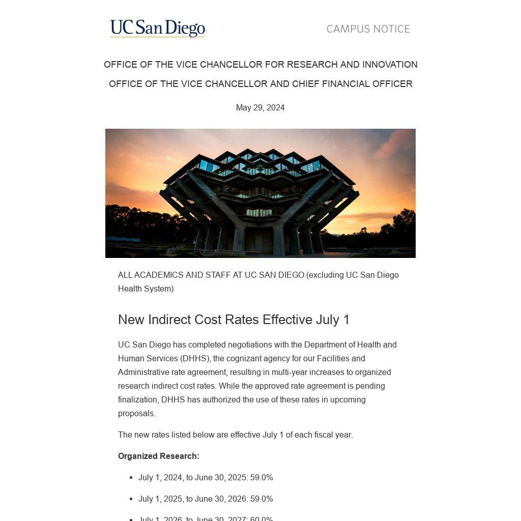 UC San Diego has completed negotiations with the Department of Health and Human Services (DHHS), the cognizant agency for our Facilities and Administrative rate agreement, resulting in multi-year increases to organized research indirect cost rates. While the approved rate agreement is pending finalization, DHHS has authorized the use of these rates in upcoming proposals.
