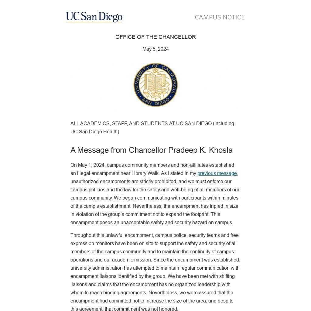 The violation of law and campus policy represented by this encampment, however, is not a peaceful protest. It has become dangerous. As University of California Board of Regents Chair Richard Leib recently stated in his letter to the university community, “Protests that interfere with university operations or threaten the safety of students require immediate enforcement of university policies.”