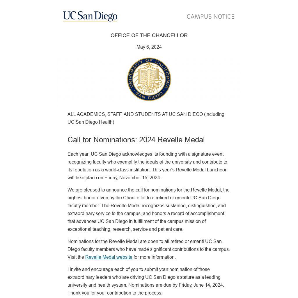 We are pleased to announce the call for nominations for the Revelle Medal, the highest honor given by the Chancellor to a retired or emeriti UC San Diego faculty member. The Revelle Medal recognizes sustained, distinguished, and extraordinary service to the campus, and honors a record of accomplishment that advances UC San Diego in fulfillment of the campus mission of exceptional teaching, research, service and patient care.