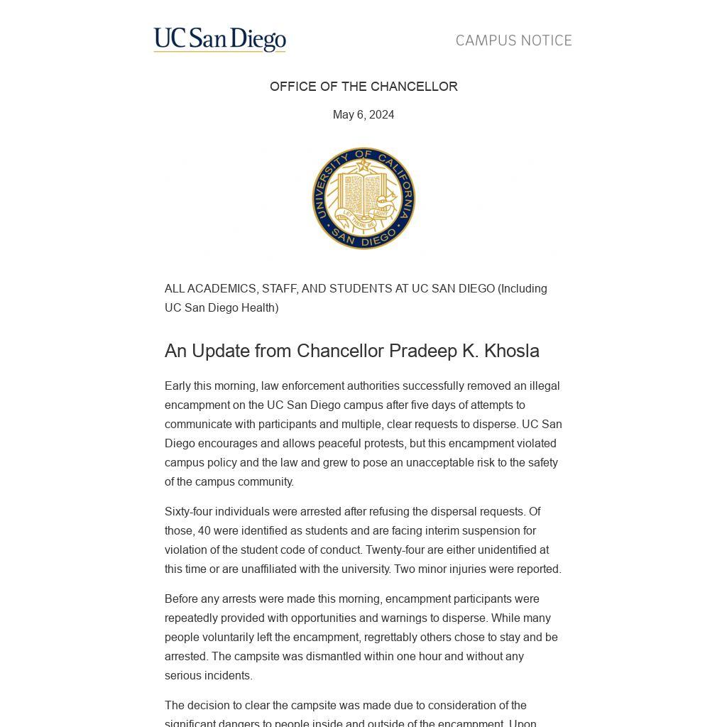 Early this morning, law enforcement authorities successfully removed an illegal encampment on the UC San Diego campus after five days of attempts to communicate with participants and multiple, clear requests to disperse. UC San Diego encourages and allows peaceful protests, but this encampment violated campus policy and the law and grew to pose an unacceptable risk to the safety of the campus community.