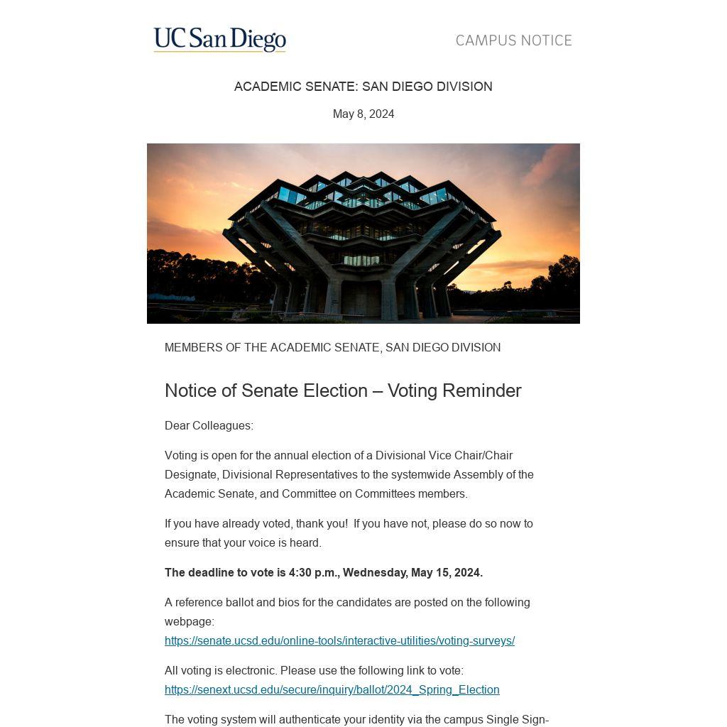 Voting is open for the annual election of a Divisional Vice Chair/Chair Designate, Divisional Representatives to the systemwide Assembly of the Academic Senate, and Committee on Committees members.