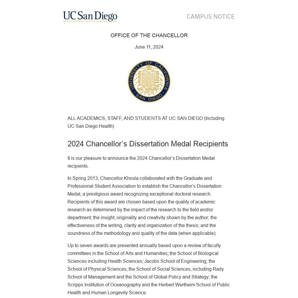 It is our pleasure to announce the 2024 Chancellor’s Dissertation Medal recipients.