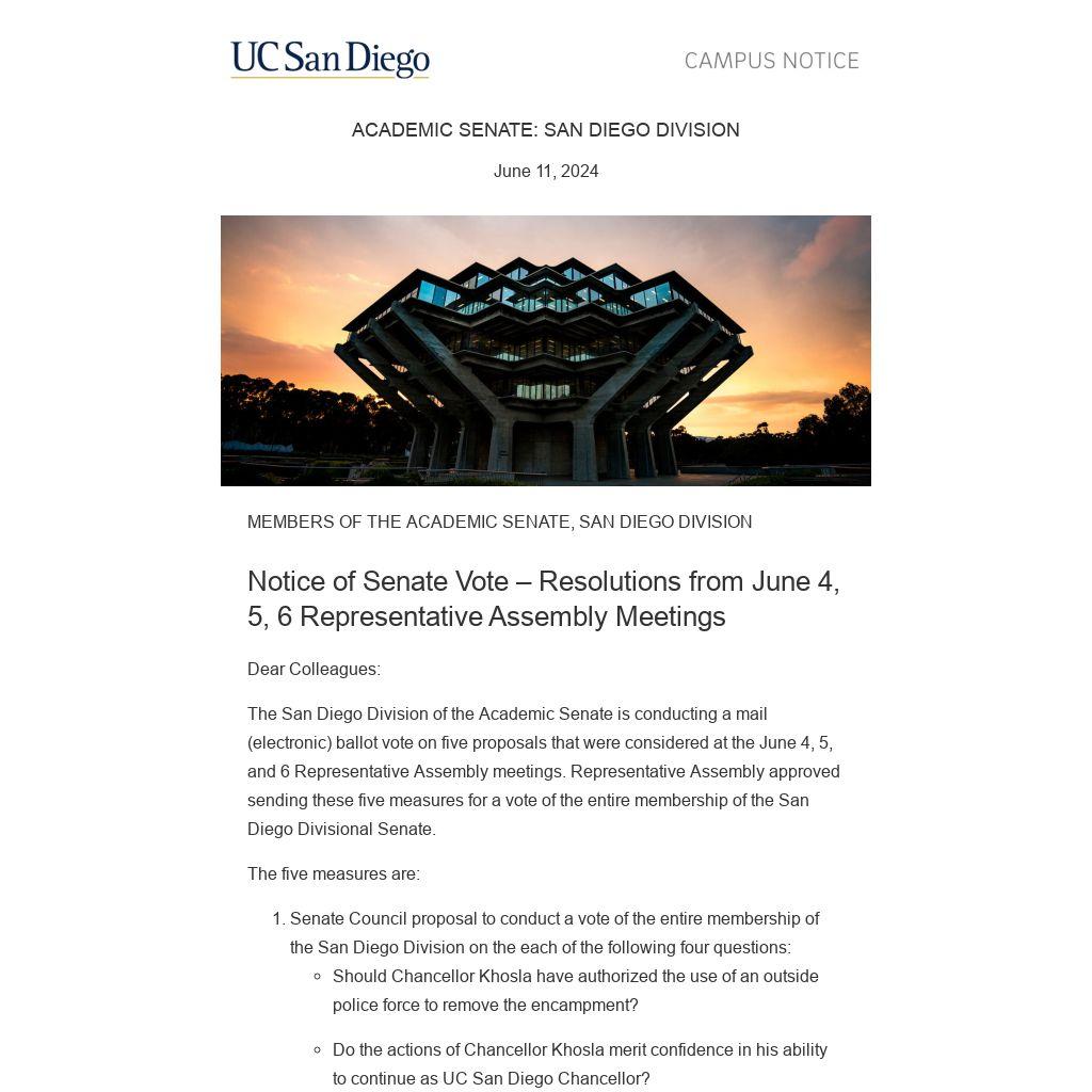 The San Diego Division of the Academic Senate is conducting a mail (electronic) ballot vote on five proposals that were considered at the June 4, 5, and 6 Representative Assembly meetings. Representative Assembly approved sending these five measures for a vote of the entire membership of the San Diego Divisional Senate.