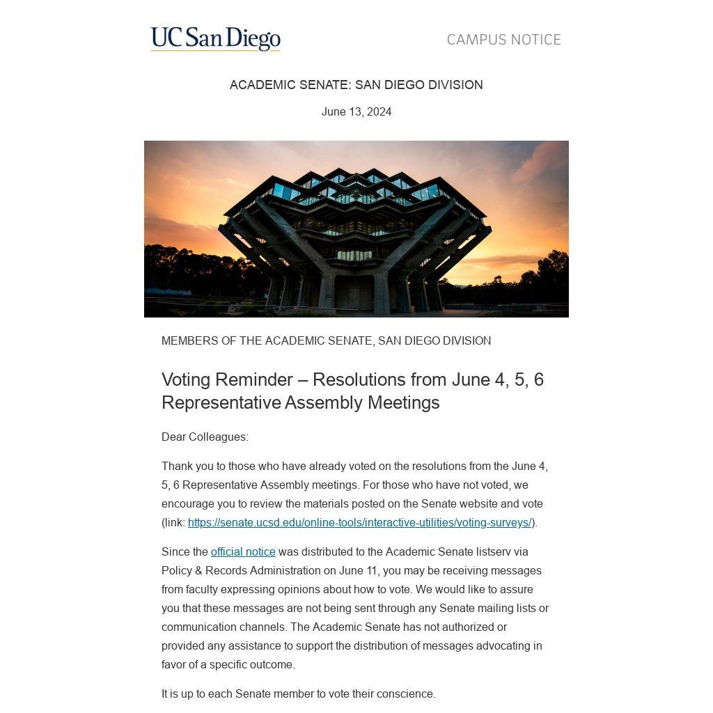 Thank you to those who have already voted on the resolutions from the June 4, 5, 6 Representative Assembly meetings. For those who have not voted, we encourage you to review the materials posted on the Senate website and vote (link: https://senate.ucsd.edu/online-tools/interactive-utilities/voting-surveys/).