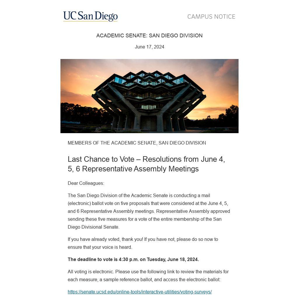 The San Diego Division of the Academic Senate is conducting a mail (electronic) ballot vote on five proposals that were considered at the June 4, 5, and 6 Representative Assembly meetings. Representative Assembly approved sending these five measures for a vote of the entire membership of the San Diego Divisional Senate.