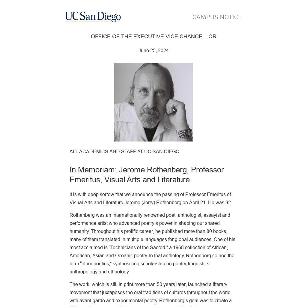 It is with deep sorrow that we announce the passing of Professor Emeritus of Visual Arts and Literature Jerome (Jerry) Rothenberg on April 21. He was 92.