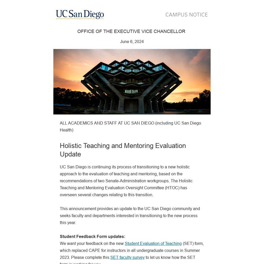 UC San Diego is continuing its process of transitioning to a new holistic approach to the evaluation of teaching and mentoring, based on the recommendations of two Senate-Administration workgroups. The Holistic Teaching and Mentoring Evaluation Oversight Committee (HTOC) has overseen several changes relating to this transition.