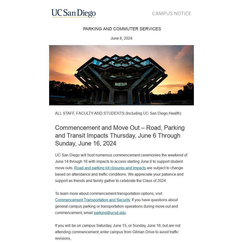UC San Diego will host numerous commencement ceremonies the weekend of June 14 through 16 with impacts to access starting June 6 to support student move outs. Road and parking lot closures and impacts are subject to change based on attendance and traffic conditions. We appreciate your patience and support as friends and family gather to celebrate the Class of 2024.