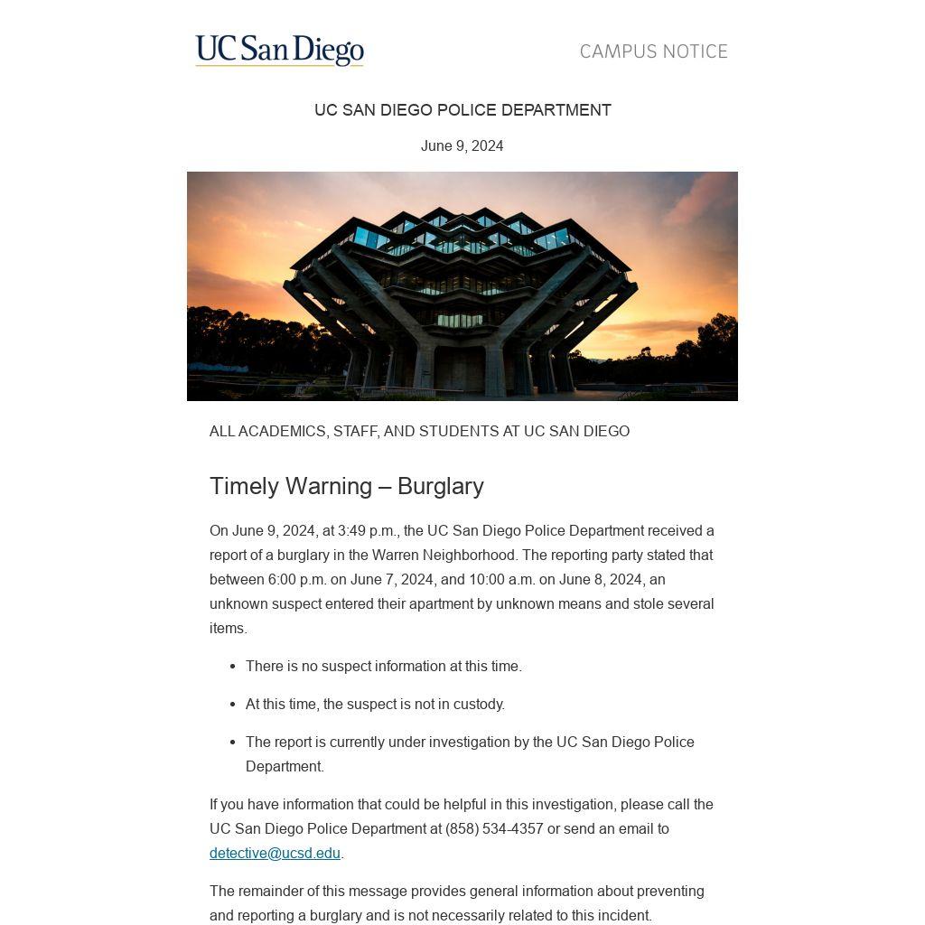 On June 9, 2024, at 3:49 p.m., the UC San Diego Police Department received a report of a burglary in the Warren Neighborhood. The reporting party stated that between 6:00 p.m. on June 7, 2024, and 10:00 a.m. on June 8, 2024, an unknown suspect entered their apartment by unknown means and stole several items.