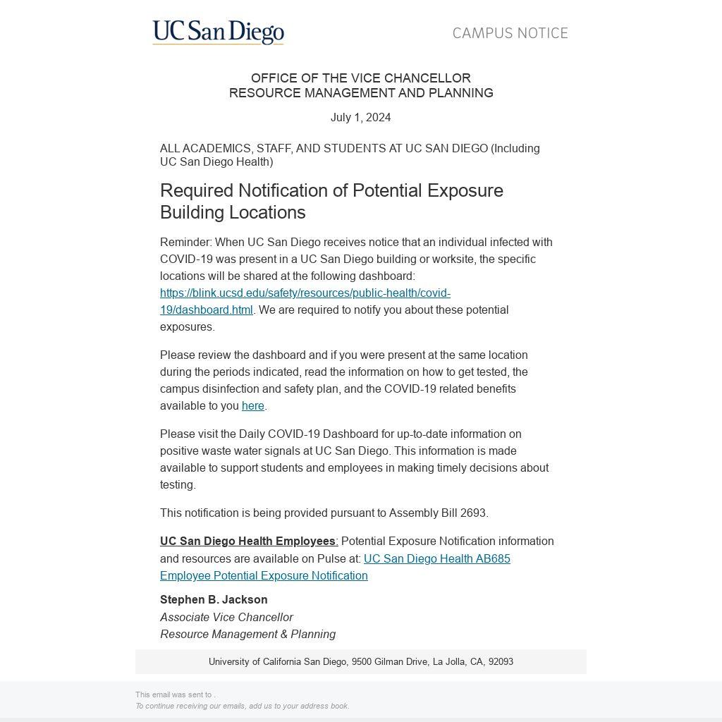 Reminder: When UC San Diego receives notice that an individual infected with COVID‐19 was present in a UC San Diego building or worksite, the specific locations will be shared at the following dashboard: https://blink.ucsd.edu/safety/resources/public-health/covid-19/dashboard.html. We are required to notify you about these potential exposures.