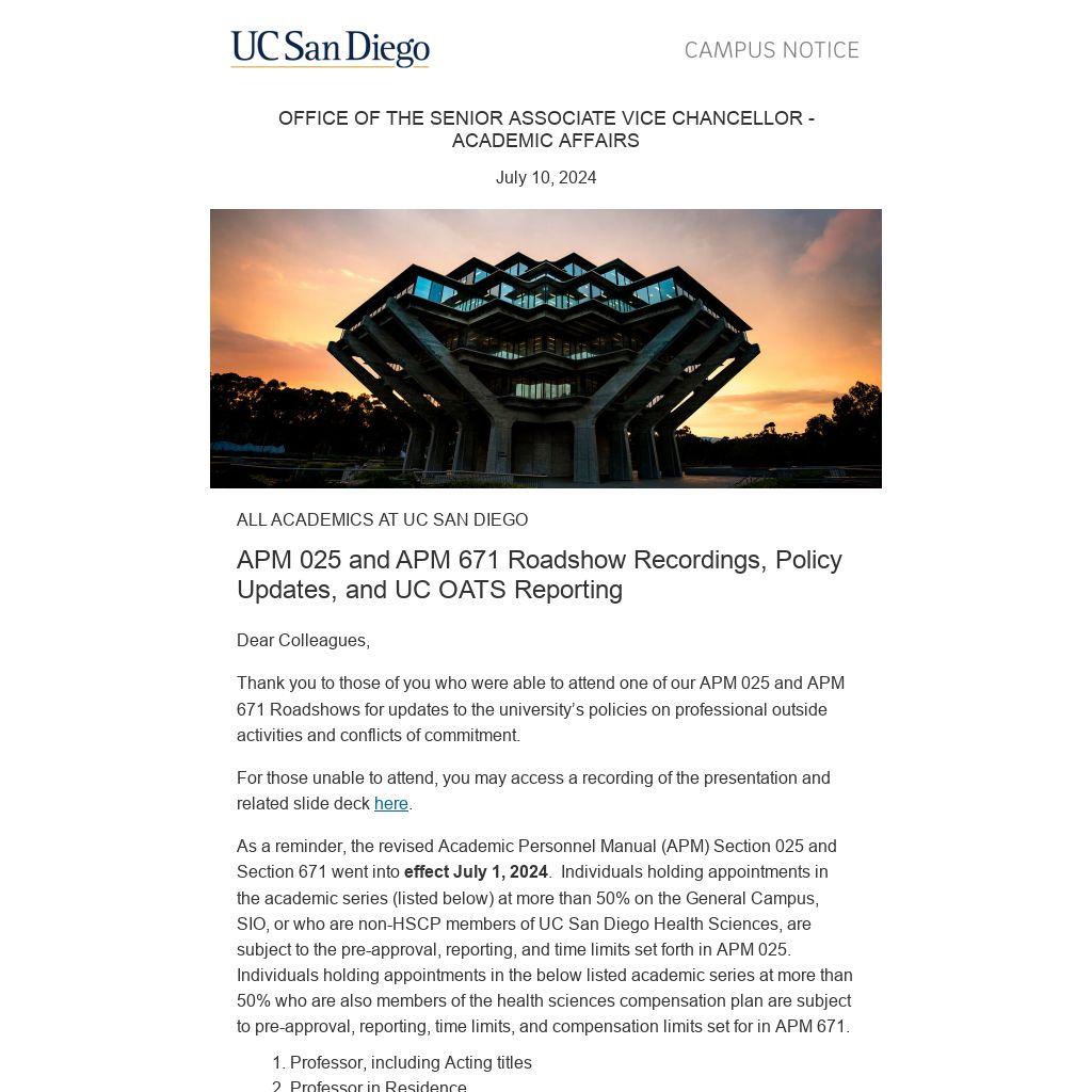 APM 025 and APM 671 Roadshow Recordings, Policy Updates, and UC OATS Reporting |