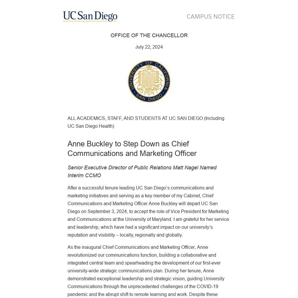 After a successful tenure leading UC San Diego’s communications and marketing initiatives and serving as a key member of my Cabinet, Chief Communications and Marketing Officer Anne Buckley will depart UC San Diego on September 3, 2024, to accept the role of Vice President for Marketing and Communications at the University of Maryland. I am grateful for her service and leadership, which have had a significant impact on our university’s reputation and visibility – locally, regionally and globally.