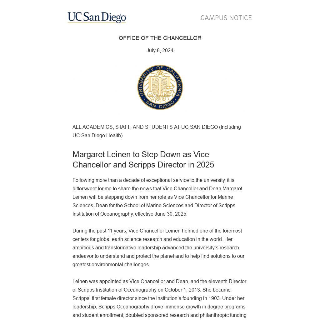 Following more than a decade of exceptional service to the university, it is bittersweet for me to share the news that Vice Chancellor and Dean Margaret Leinen will be stepping down from her role as Vice Chancellor for Marine Sciences, Dean for the School of Marine Sciences and Director of Scripps Institution of Oceanography, effective June 30, 2025.