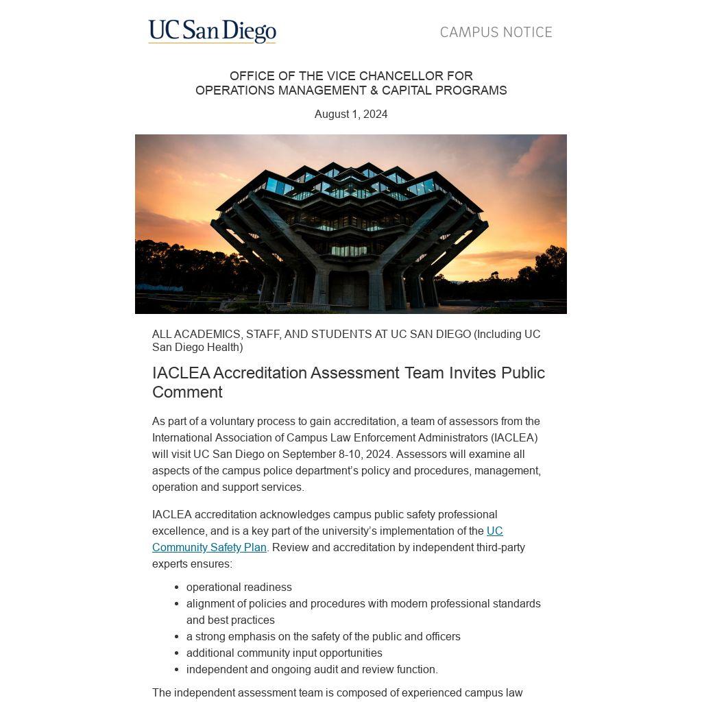 Members of the campus community are invited to offer comments about the campus police department by calling (858) 822-6646 between the hours of 3 p.m. and 5 p.m. on Monday, September 9, 2024. Comments will be collected by the assessment team.