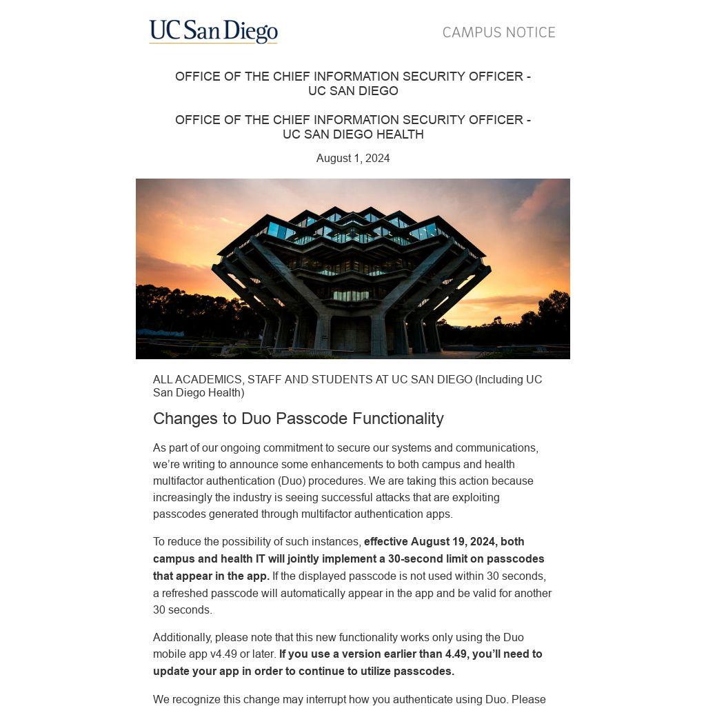 As part of our ongoing commitment to secure our systems and communications, we’re writing to announce some enhancements to both campus and health multifactor authentication (Duo) procedures. We are taking this action because increasingly the industry is seeing successful attacks that are exploiting passcodes generated through multifactor authentication apps.