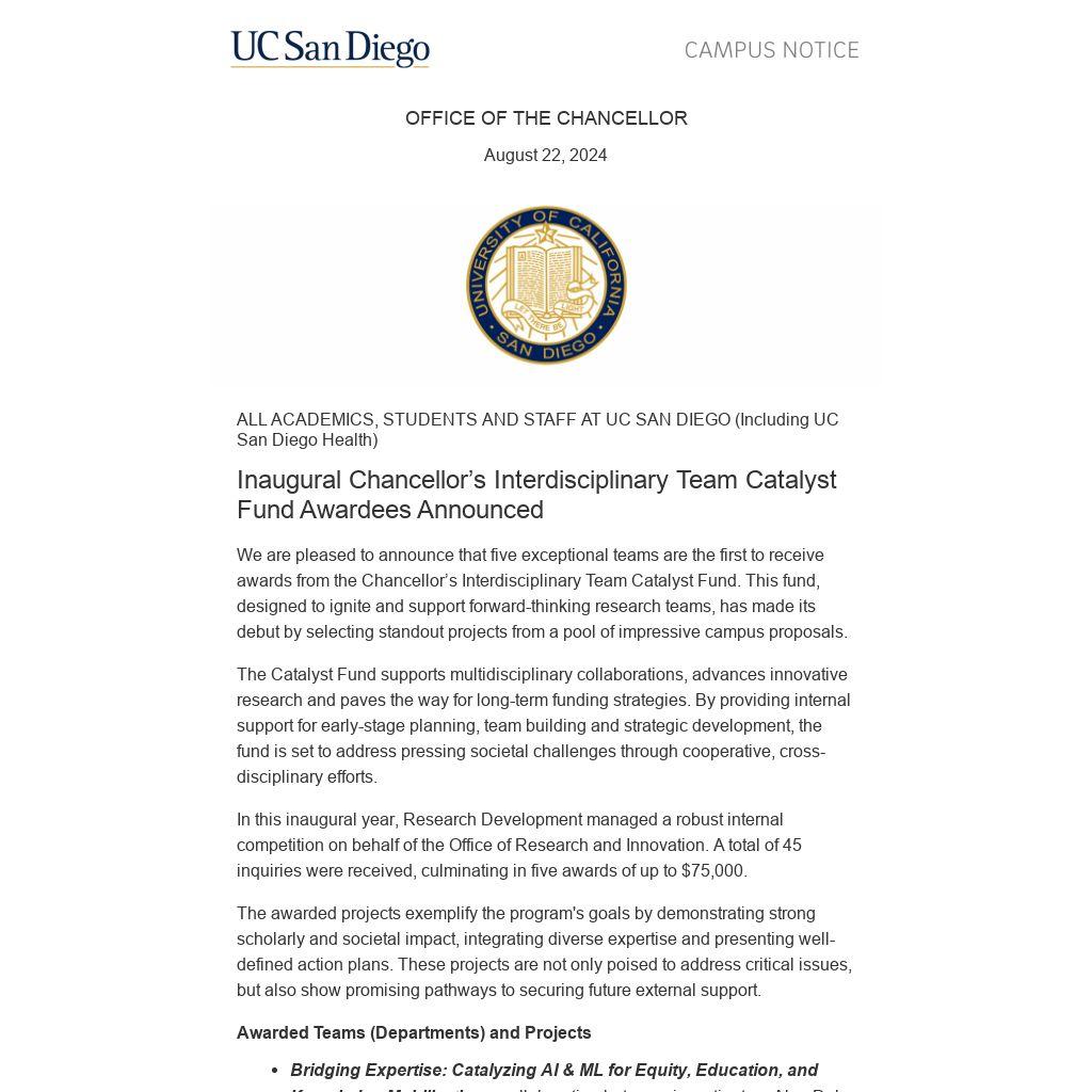 We are pleased to announce that five exceptional teams are the first to receive awards from the Chancellor’s Interdisciplinary Team Catalyst Fund. This fund, designed to ignite and support forward-thinking research teams, has made its debut by selecting standout projects from a pool of impressive campus proposals.
