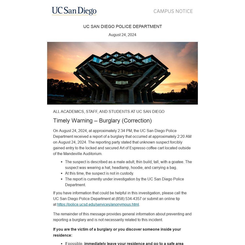 On August 24, 2024, at approximately 2:34 PM, the UC San Diego Police Department received a report of a burglary that occurred at approximately 2:20 AM on August 24, 2024. The reporting party stated that unknown suspect forcibly gained entry to the locked and secured Art of Espresso coffee cart located outside of the Mandeville Auditorium.