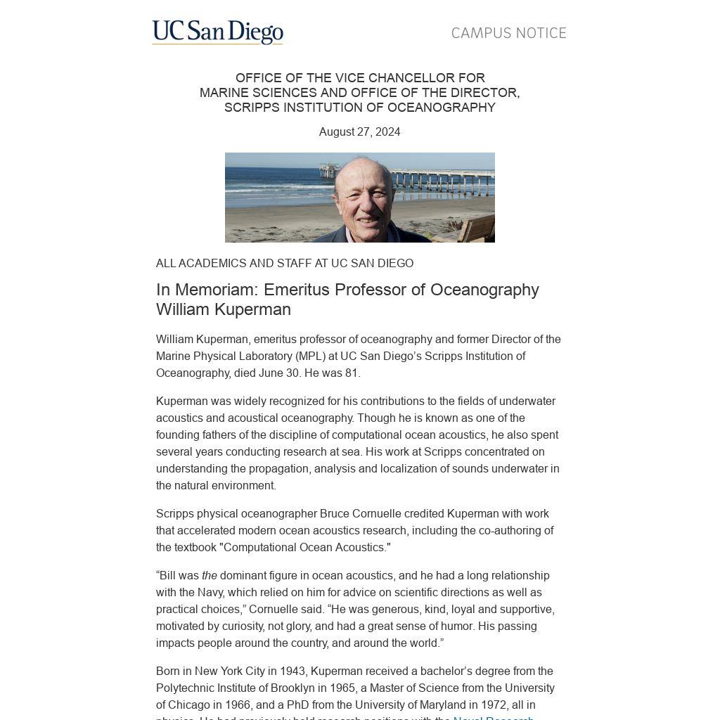 Scripps physical oceanographer Bruce Cornuelle credited Kuperman with work that accelerated modern ocean acoustics research, including the co-authoring of the textbook "Computational Ocean Acoustics."