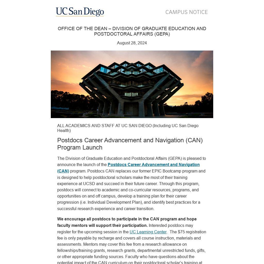 The Division of Graduate Education and Postdoctoral Affairs (GEPA) is pleased to announce the launch of the Postdocs Career Advancement and Navigation (CAN) program. Postdocs CAN replaces our former EPIC Bootcamp program and is designed to help postdoctoral scholars make the most of their training experience at UCSD and succeed in their future career. Through this program, postdocs will connect to academic and co-curricular resources, programs, and opportunities on and off campus, develop a training plan for their career progression (i.e. Individual Development Plan), and identify best practices for a successful research experience and career transition.