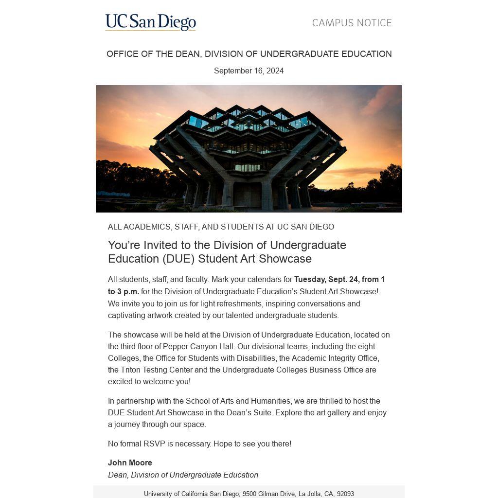 The showcase will be held at the Division of Undergraduate Education, located on the third floor of Pepper Canyon Hall. Our divisional teams, including the eight Colleges, the Office for Students with Disabilities, the Academic Integrity Office, the Triton Testing Center and the Undergraduate Colleges Business Office are excited to welcome you!