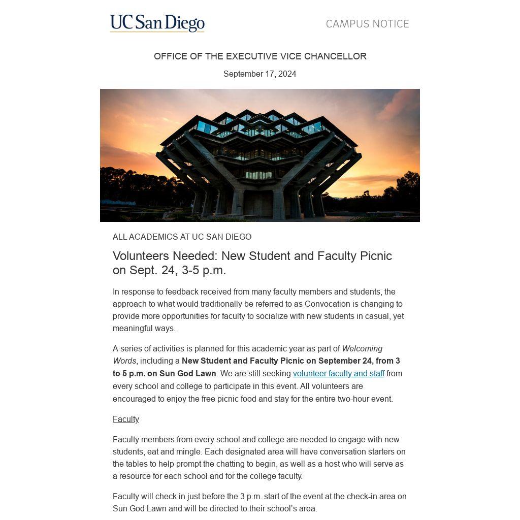 If you have any questions about this event, please reach out to Nic Alonzo, Assistant Director for Campus Life Events at nicalonzo@ucsd.edu or Megan Navamani, EVC Events Manager at evc-events@ucsd.edu.