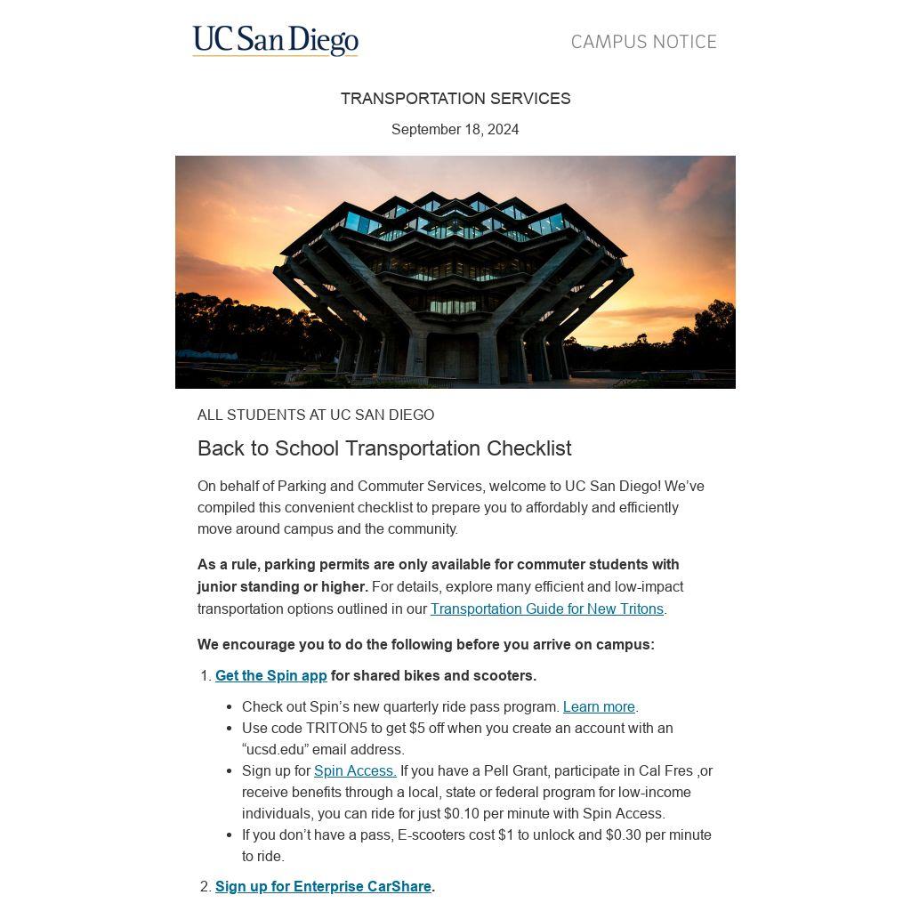 On behalf of Parking and Commuter Services, welcome to UC San Diego! We’ve compiled this convenient checklist to prepare you to affordably and efficiently move around campus and the community.