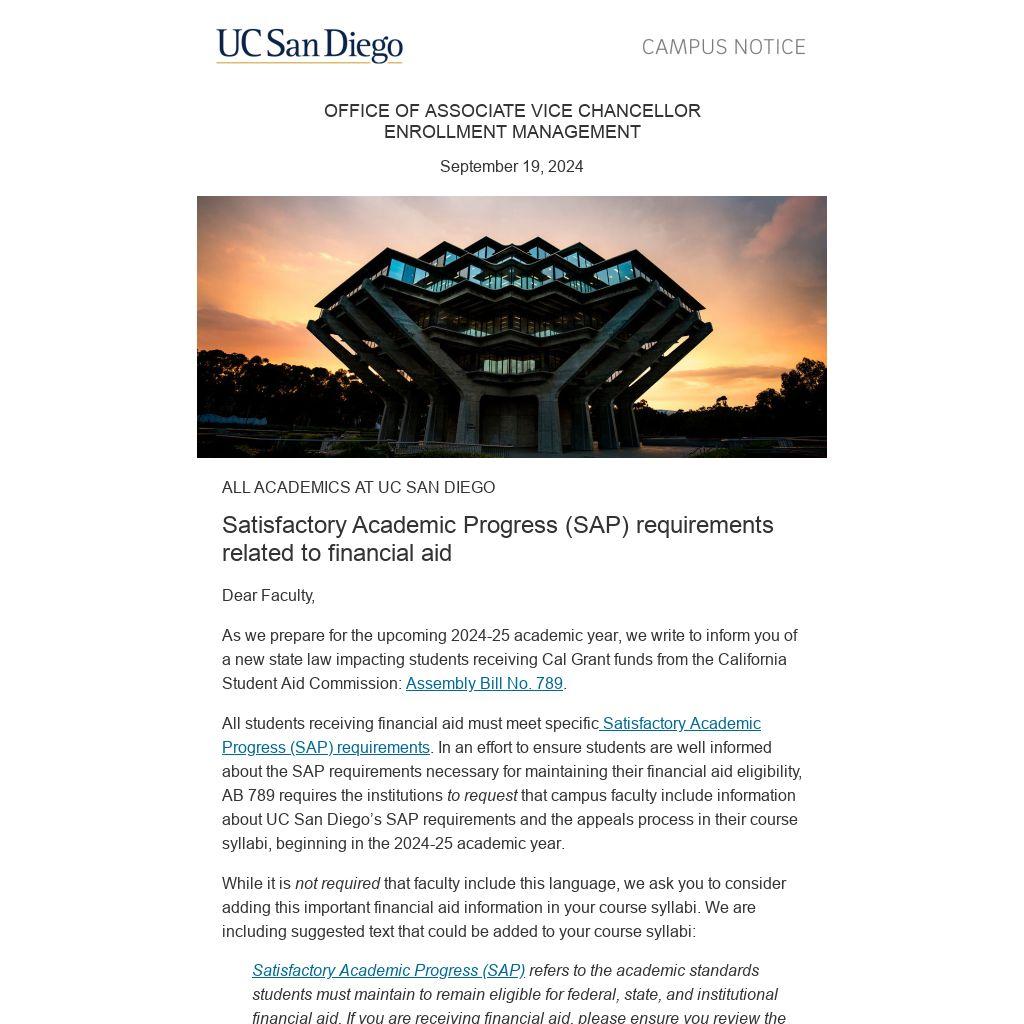 All students receiving financial aid must meet specificSatisfactory Academic Progress (SAP) requirements. In an effort to ensure students are well informed about the SAP requirements necessary for maintaining their financial aid eligibility, AB 789 requires the institutions to request that campus faculty include information about UC San Diego’s SAP requirements and the appeals process in their course syllabi, beginning in the 2024-25 academic year.