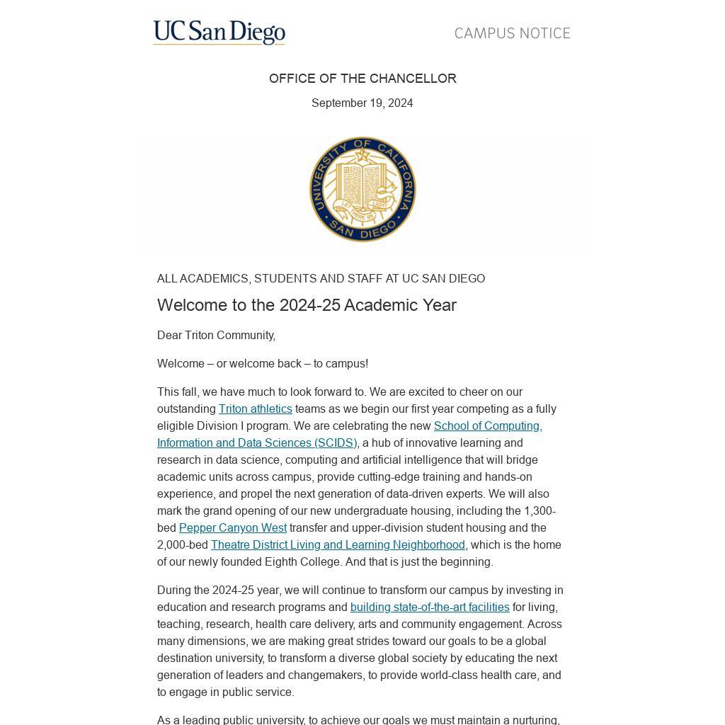 This fall, we have much to look forward to. We are excited to cheer on our outstanding Triton athletics teams as we begin our first year competing as a fully eligible Division I program. We are celebrating the new School of Computing, Information and Data Sciences (SCIDS), a hub of innovative learning and research in data science, computing and artificial intelligence that will bridge academic units across campus, provide cutting-edge training and hands-on experience, and propel the next generation of data-driven experts. We will also mark the grand opening of our new undergraduate housing, including the 1,300-bed Pepper Canyon West transfer and upper-division student housing and the 2,000-bed Theatre District Livingand Learning Neighborhood, which is the home of our newly founded Eighth College. And that is just the beginning.