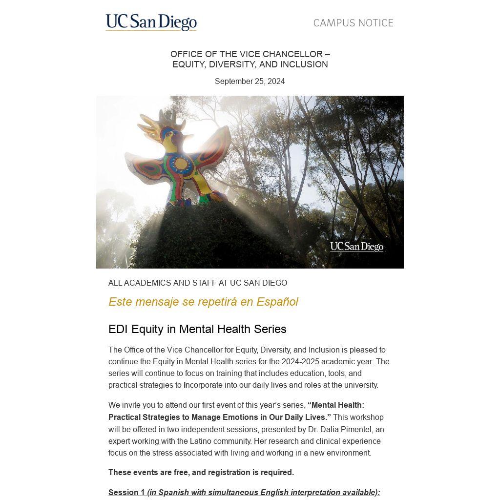 In addition, we are also pleased to announce the premiere of a Spanish-language episode of the Equity in Mental Health Series podcast. This new addition reflects UC San Diego’s commitment to being aHispanic Serving Institution, and fosters inclusive conversations around mental health that provide equitable access to valuable resources and insights so that all members of our Triton community benefit.