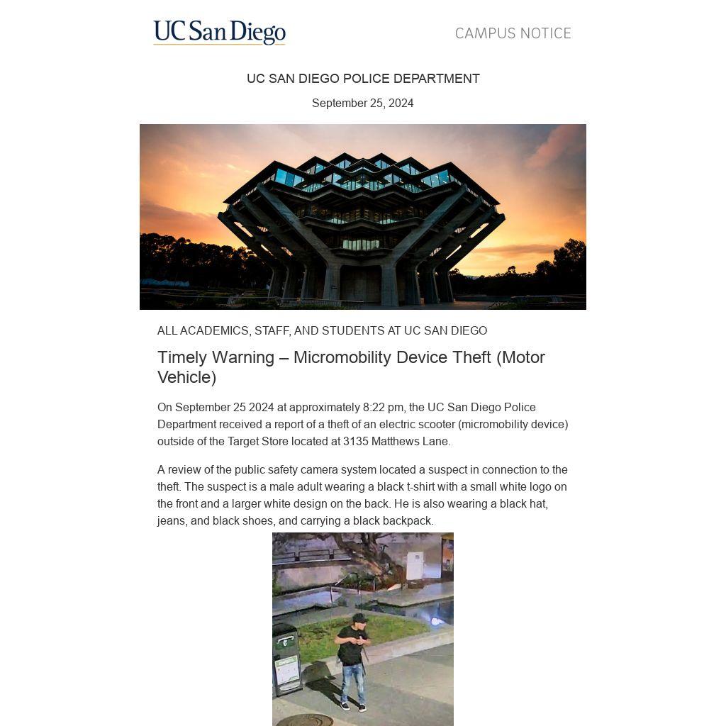 On September 25 2024 at approximately 8:22 pm, the UC San Diego Police Department received a report of a theft of an electric scooter (micromobility device) outside of the Target Store located at 3135 Matthews Lane.