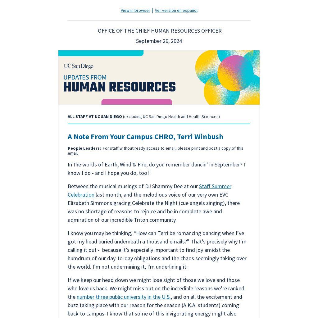 The last day to complete the Staff@Work Survey is now Fri., Oct. 4. To those who have already completed it, thank you. For those who haven’t, the next Staff@Work Survey won’t take place again until 2026 to allow for time to address your feedback through action plans, so please take this opportunity to let your voice be heard! Search for an email from sawsurvey@ucsd.edu from August 28. This year, we are excited to announce a donation will be made to the Triton Food Pantry. Visit Blink for details on past results.