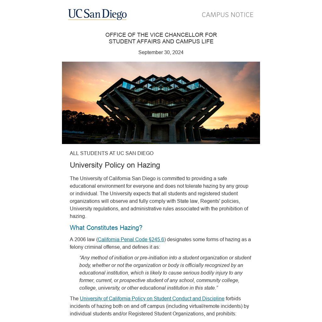 The University of California San Diego is committed to providing a safe educational environment for everyone and does not tolerate hazing by any group or individual. The University expects that all students and registered student organizations will observe and fully comply with State law, Regents' policies, University regulations, and administrative rules associated with the prohibition of hazing.