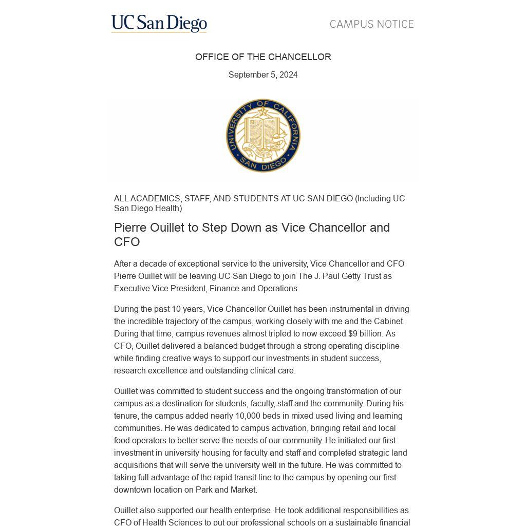 During the past 10 years, Vice Chancellor Ouillet has been instrumental in driving the incredible trajectory of the campus, working closely with me and the Cabinet. During that time, campus revenues almost tripled to now exceed $9 billion. As CFO, Ouillet delivered a balanced budget through a strong operating discipline while finding creative ways to support our investments in student success, research excellence and outstanding clinical care.