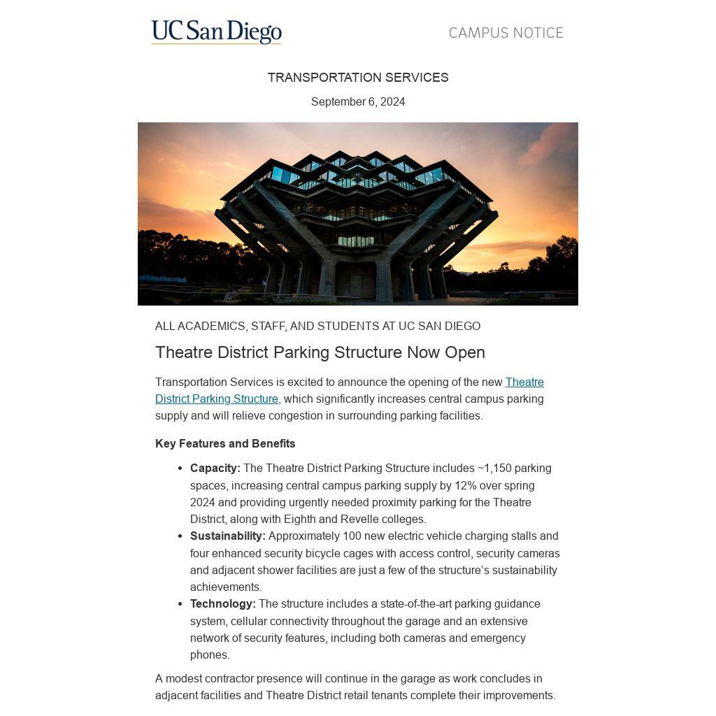 - Capacity: The Theatre District Parking Structure includes ~1,150 parking spaces, increasing central campus parking supply by 12% over spring 2024 and providing urgently needed proximity parking for the Theatre District, along with Eighth and Revelle colleges.