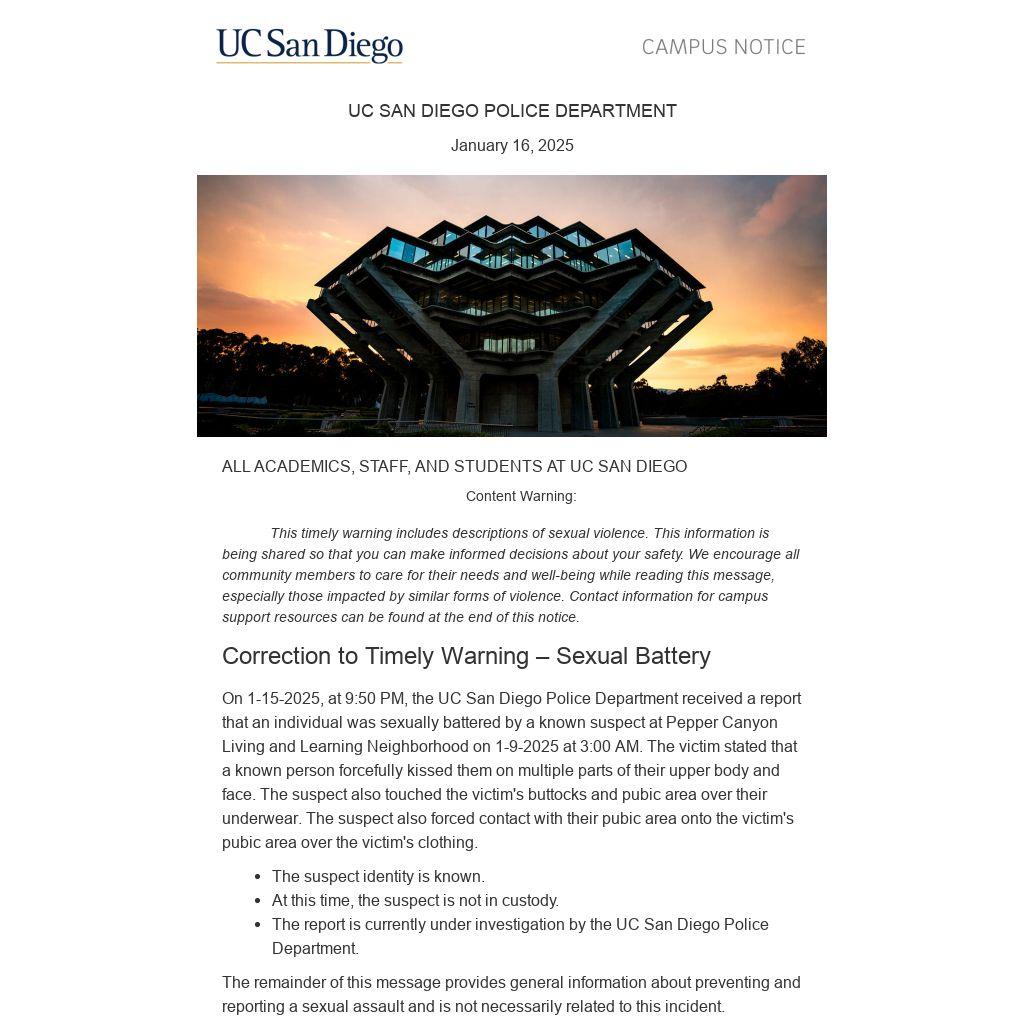 On 1-15-2025, at 9:50 PM, the UC San Diego Police Department received a report that an individual was sexually battered by a known suspect at Pepper Canyon Living and Learning Neighborhood on 1-9-2025 at 3:00 AM. The victim stated that a known person forcefully kissed them on multiple parts of their upper body and face. The suspect also touched the victim's buttocks and pubic area over their underwear. The suspect also forced contact with their pubic area onto the victim's pubic area over the victim's clothing.