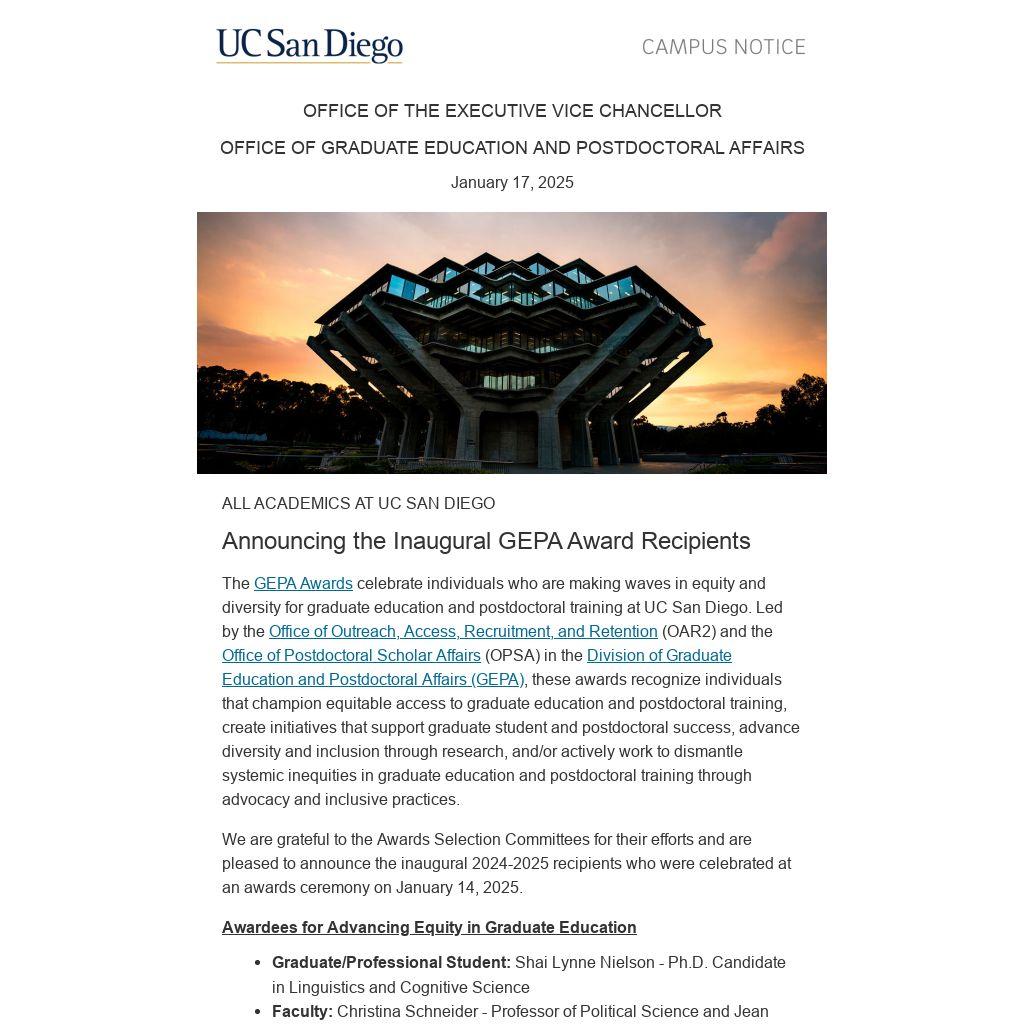 The GEPA Awards celebrate individuals who are making waves in equity and diversity for graduate education and postdoctoral training at UC San Diego. Led by the Office of Outreach, Access, Recruitment, and Retention (OAR2) and the Office of Postdoctoral Scholar Affairs (OPSA) in the Division of Graduate Education and Postdoctoral Affairs (GEPA), these awards recognize individuals that champion equitable access to graduate education and postdoctoral training, create initiatives that support graduate student and postdoctoral success, advance diversity and inclusion through research, and/or actively work to dismantle systemic inequities in graduate education and postdoctoral training through advocacy and inclusive practices.