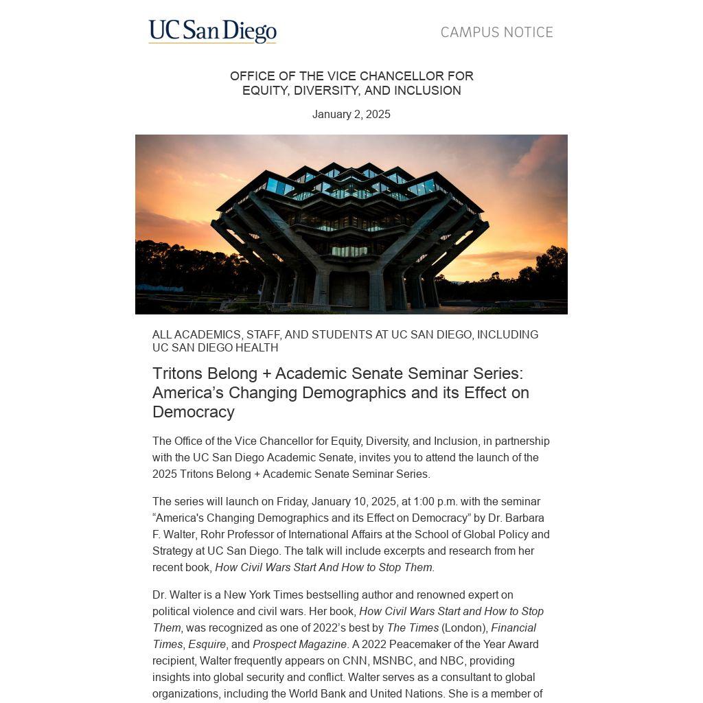 The Office of the Vice Chancellor for Equity, Diversity, and Inclusion, in partnership with the UC San Diego Academic Senate, invites you to attend the launch of the 2025 Tritons Belong + Academic Senate Seminar Series.
