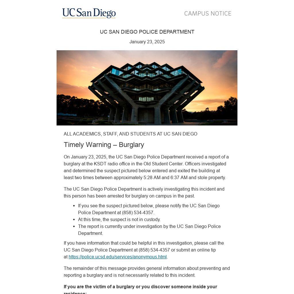 On January 23, 2025, the UC San Diego Police Department received a report of a burglary at the KSDT radio office in the Old Student Center. Officers investigated and determined the suspect pictured below entered and exited the building at least two times between approximately 5:28 AM and 6:37 AM and stole property.