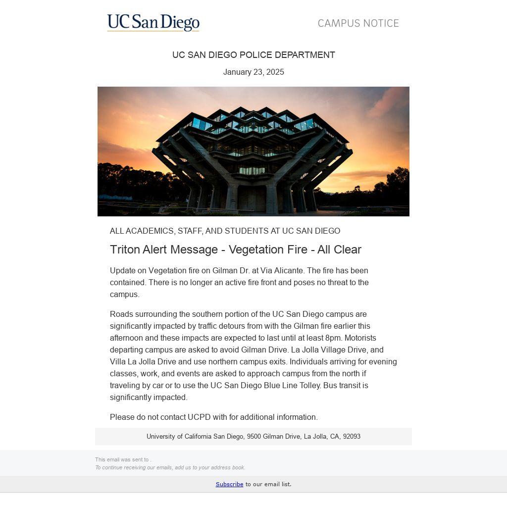 Update on Vegetation fire on Gilman Dr. at Via Alicante. The fire has been contained. There is no longer an active fire front and poses no threat to the campus.