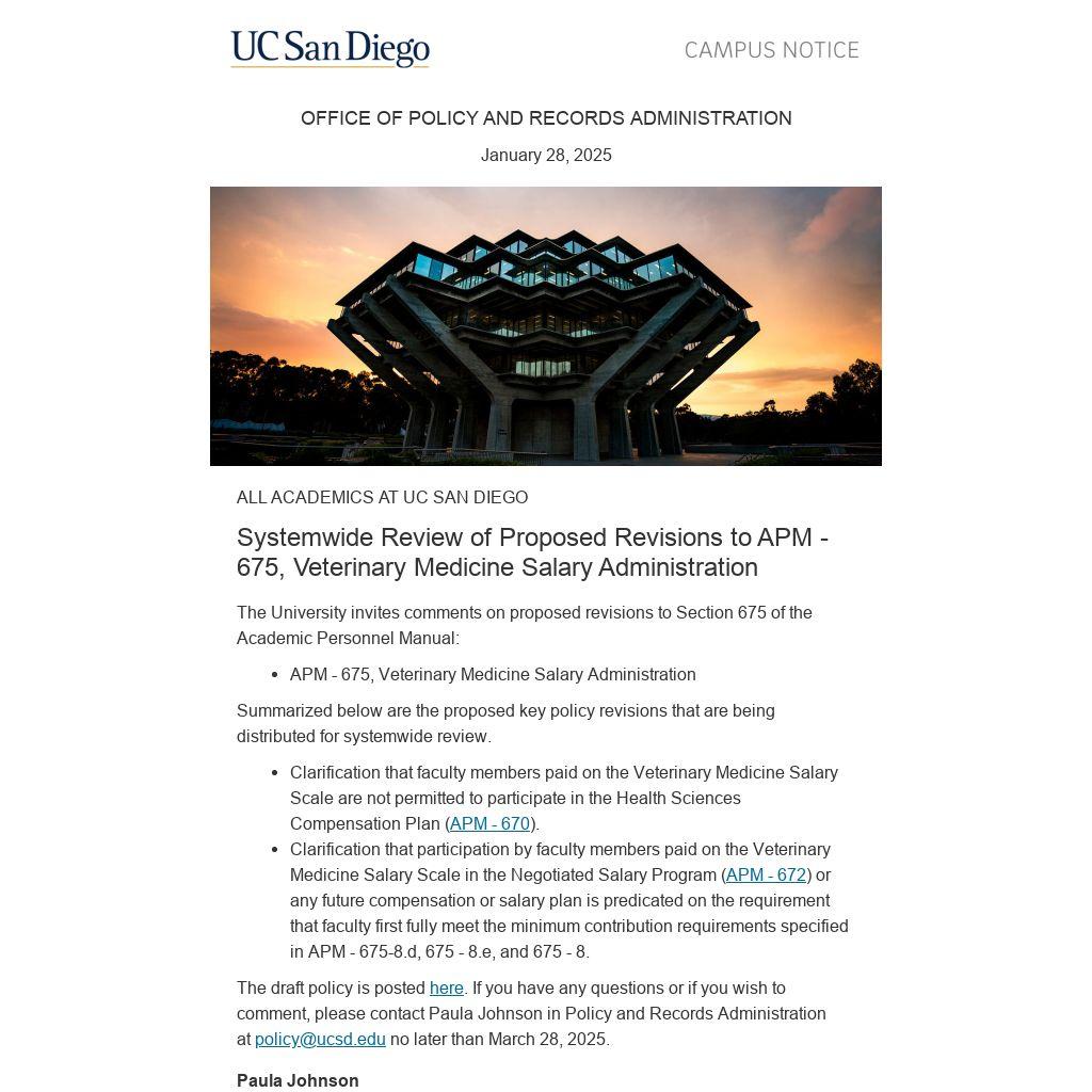 The draft policy is posted here. If you have any questions or if you wish to comment, please contact Paula Johnson in Policy and Records Administration at policy@ucsd.edu no later than March 28, 2025.