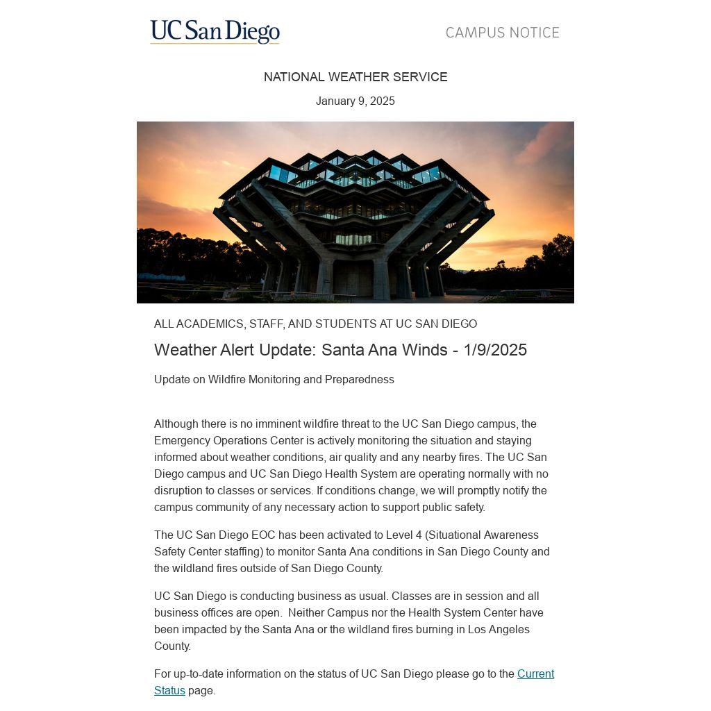 UC San Diego is conducting business as usual. Classes are in session and all business offices are open. Neither Campus nor the Health System Center have been impacted by the Santa Ana or the wildland fires burning in Los Angeles County.