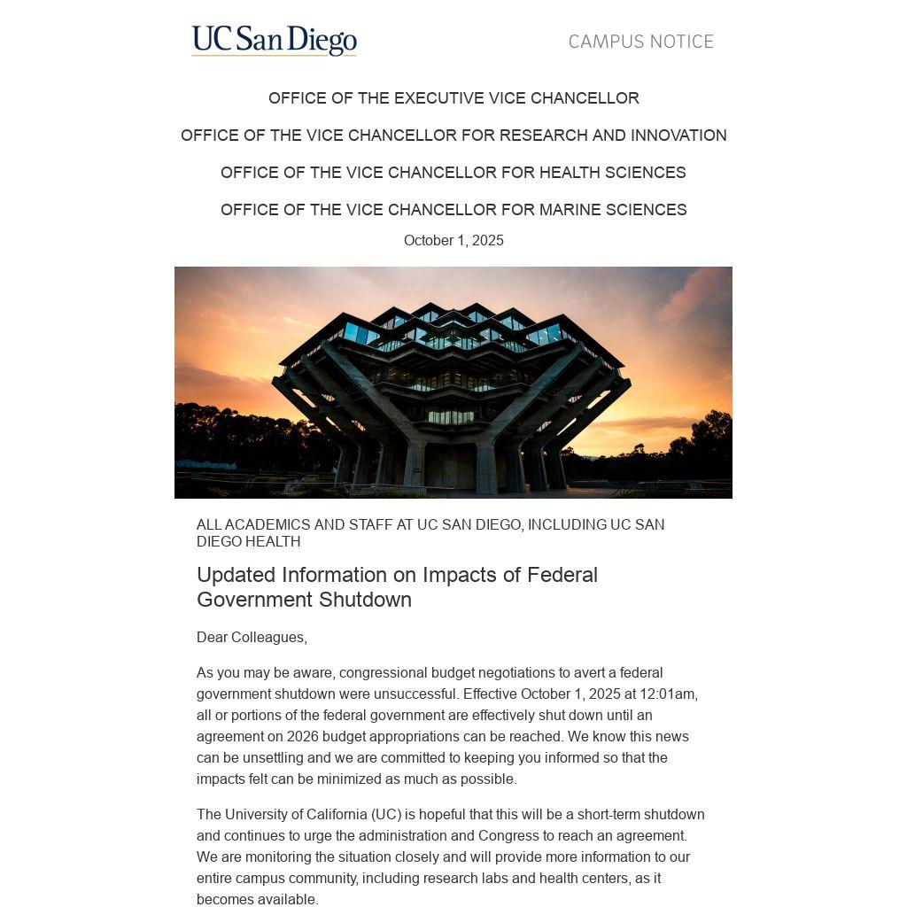 We greatly appreciate your continued patience as we all navigate this challenging situation together. We will continue to communicate with you regularly as updates become available. More detailed information will be posted, as it reaches us, athttps://keyissues.ucsd.edu/federal-government-shutdown/index.html.