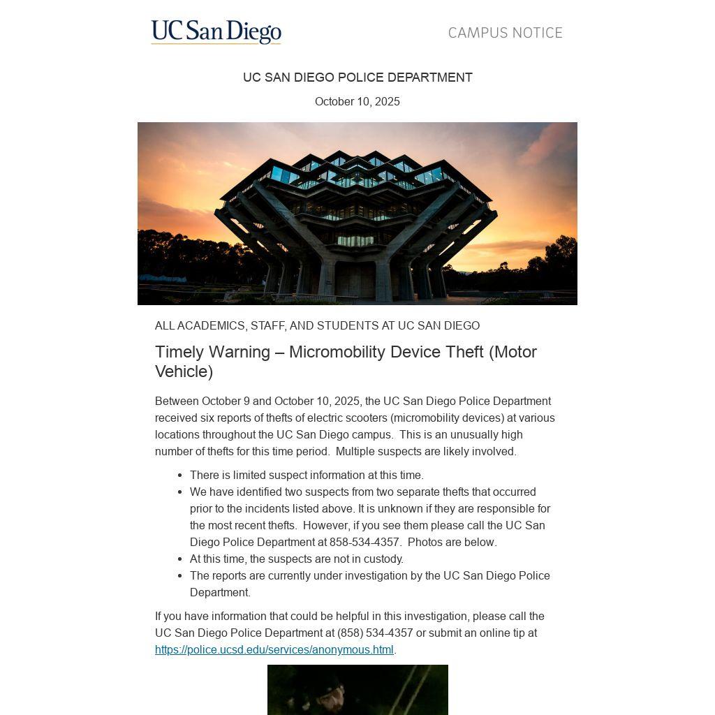 Between October 9 and October 10, 2025, the UC San Diego Police Department received six reports of thefts of electric scooters (micromobility devices) at various locations throughout the UC San Diego campus. This is an unusually high number of thefts for this time period. Multiple suspects are likely involved.