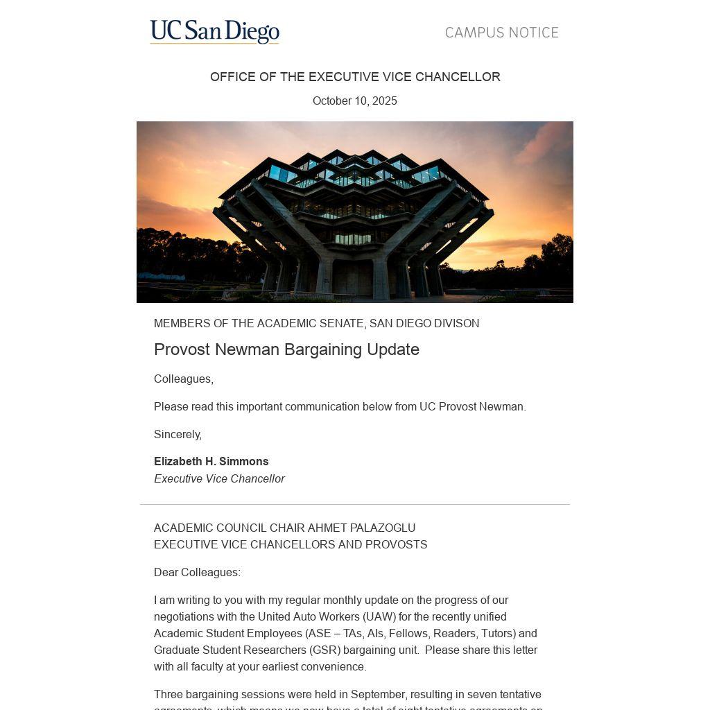 I am writing to you with my regular monthly update on the progress of our negotiations with the United Auto Workers (UAW) for the recently unified Academic Student Employees (ASE – TAs, AIs, Fellows, Readers, Tutors) and Graduate Student Researchers (GSR) bargaining unit. Please share this letter with all faculty at your earliest convenience.