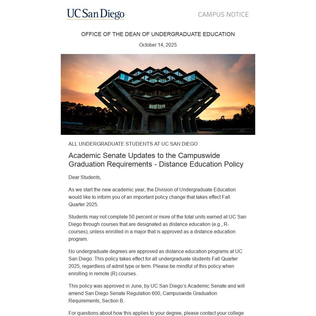 No undergraduate degrees are approved as distance education programs at UC San Diego. This policy takes effect for all undergraduate students Fall Quarter 2025, regardless of admit type or term. Please be mindful of this policy when enrolling in remote (R) courses.