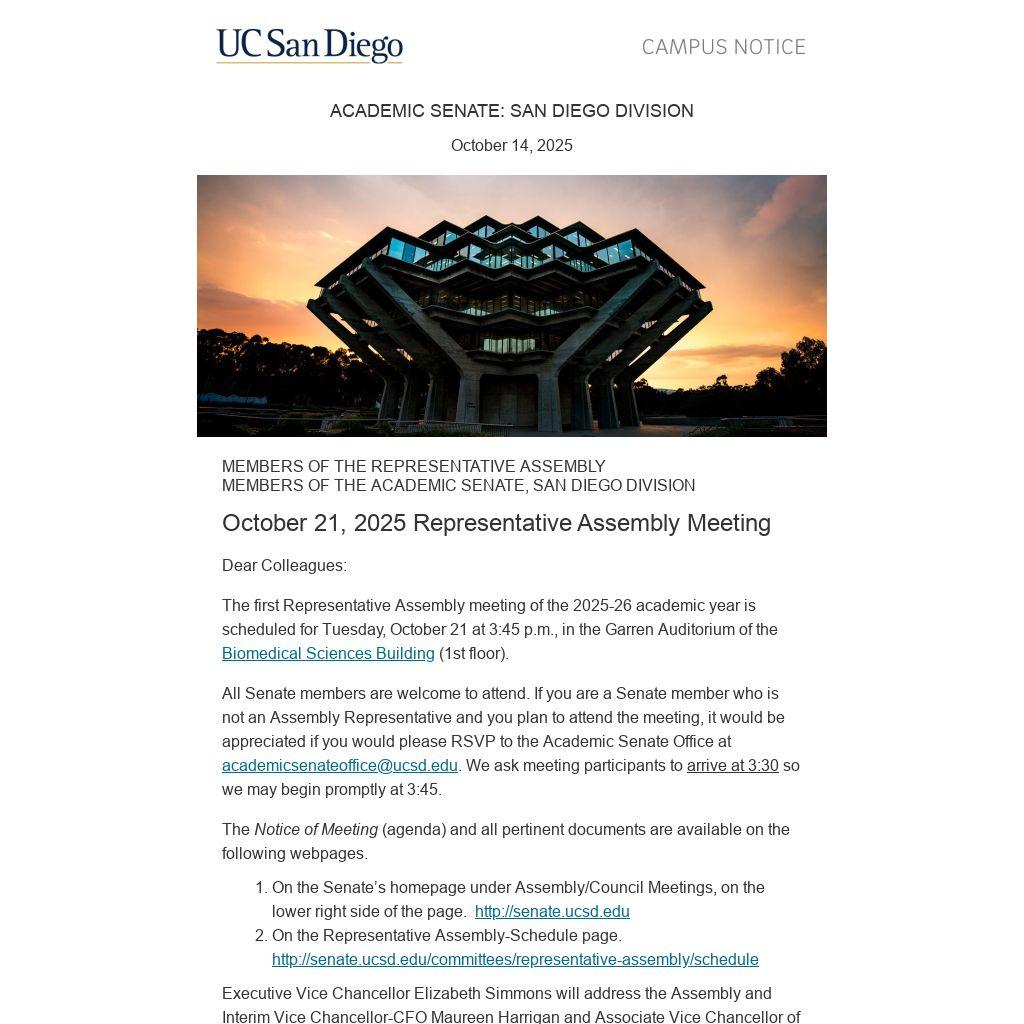 All Senate members are welcome to attend. If you are a Senate member who is not an Assembly Representative and you plan to attend the meeting, it would be appreciated if you would please RSVP to the Academic Senate Office at academicsenateoffice@ucsd.edu. We ask meeting participants to arrive at 3:30 so we may begin promptly at 3:45.