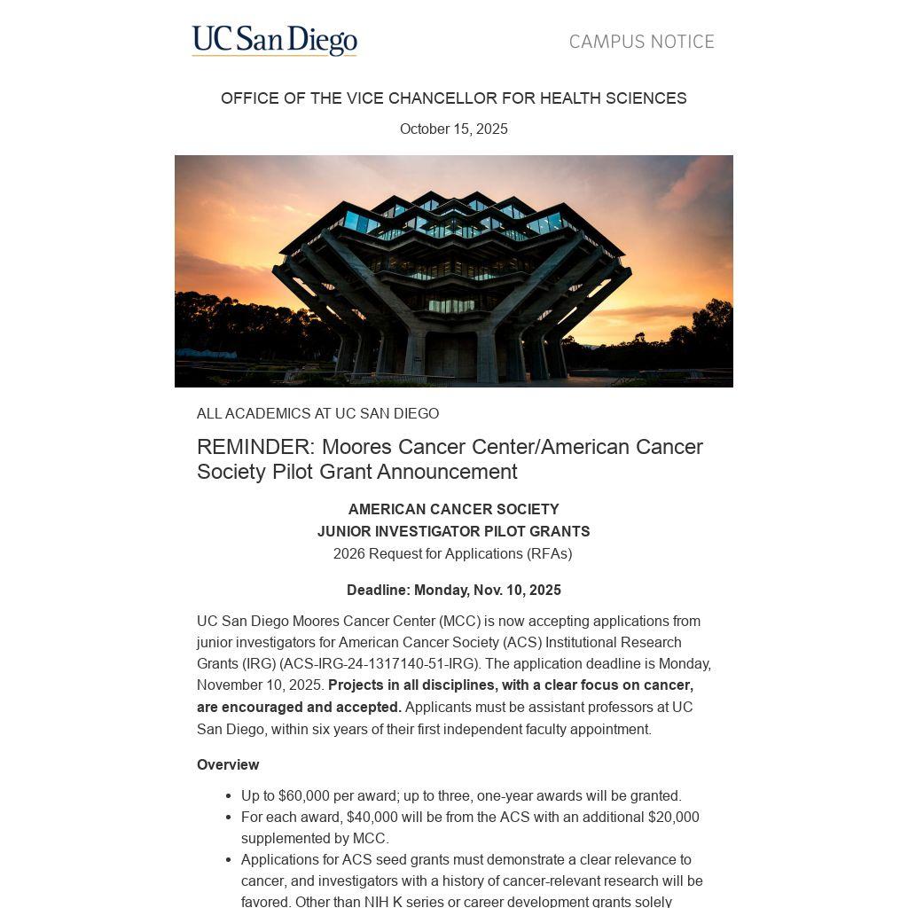 UC San Diego Moores Cancer Center (MCC) is now accepting applications from junior investigators for American Cancer Society (ACS) Institutional Research Grants (IRG) (ACS-IRG-24-1317140-51-IRG). The application deadline is Monday, November 10, 2025. Projects in all disciplines, with a clear focus on cancer, are encouraged and accepted. Applicants must be assistant professors at UC San Diego, within six years of their first independent faculty appointment.