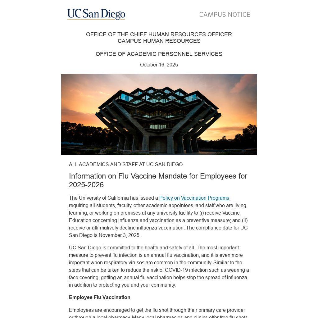 The University of California has issued a Policy on Vaccination Programs requiring all students, faculty, other academic appointees, and staff who are living, learning, or working on premises at any university facility to (i) receive Vaccine Education concerning influenza and vaccination as a preventive measure; and (ii) receive or affirmatively decline influenza vaccination. The compliance date for UC San Diego is November 3, 2025.
